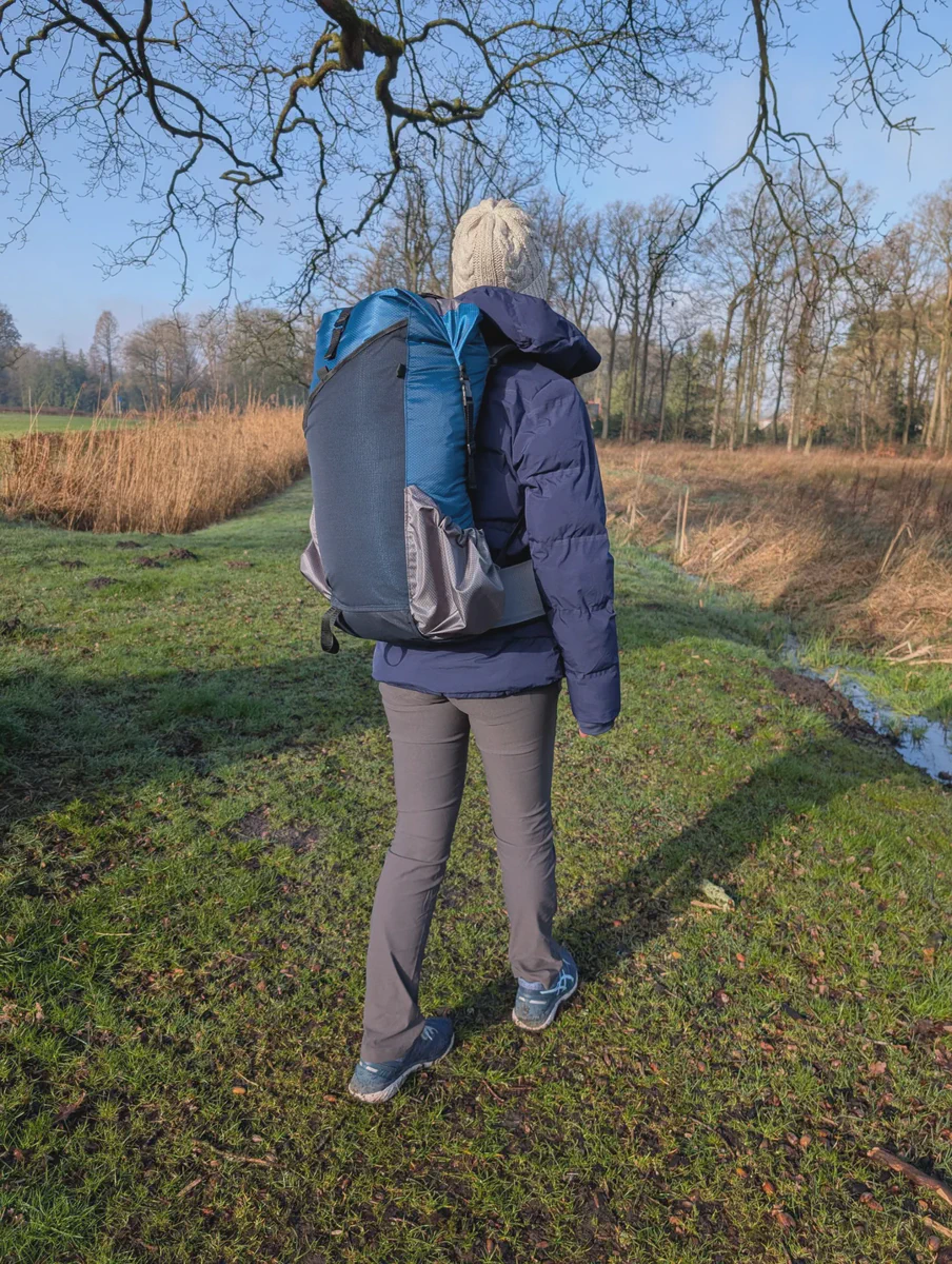 A 40L backpack, following the design of modern ultralight packs: a large roll-top main compartment with multiple external, easy access, generously sized pockets. This example pack weights ~880g including the frame, which allows it to carry loads in excess of 15kg with ease.