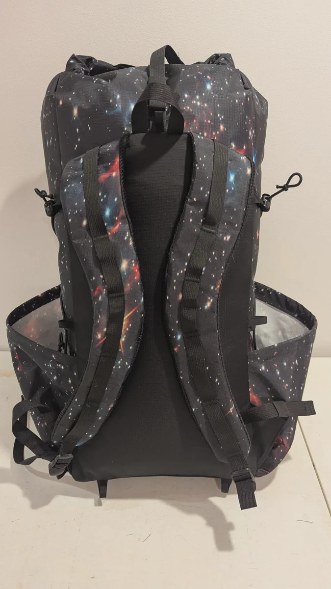 A 40L backpack, following the design of modern ultralight packs: a large roll-top main compartment with multiple external, easy access, generously sized pockets. This example pack weights ~650g