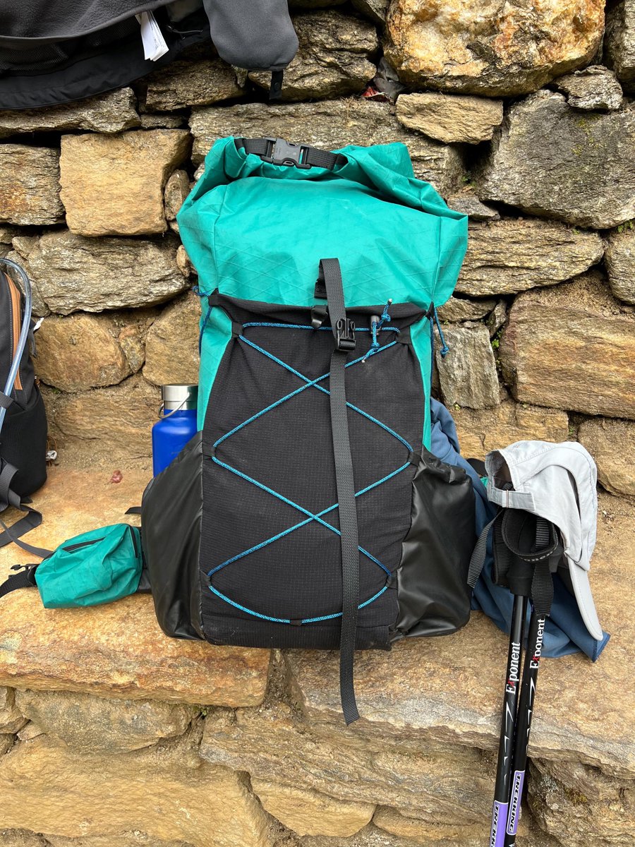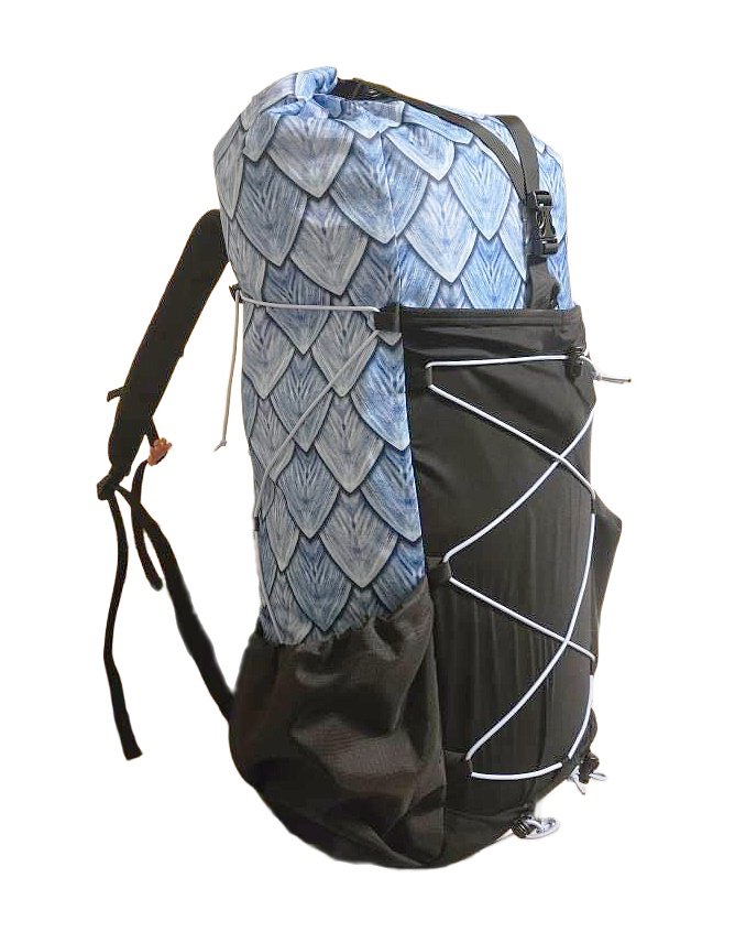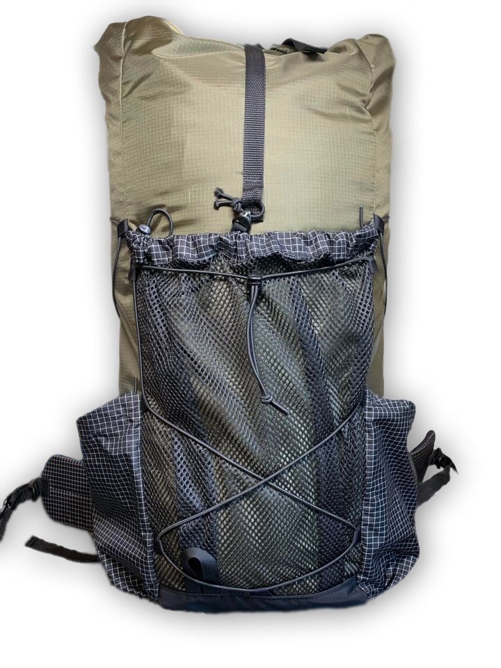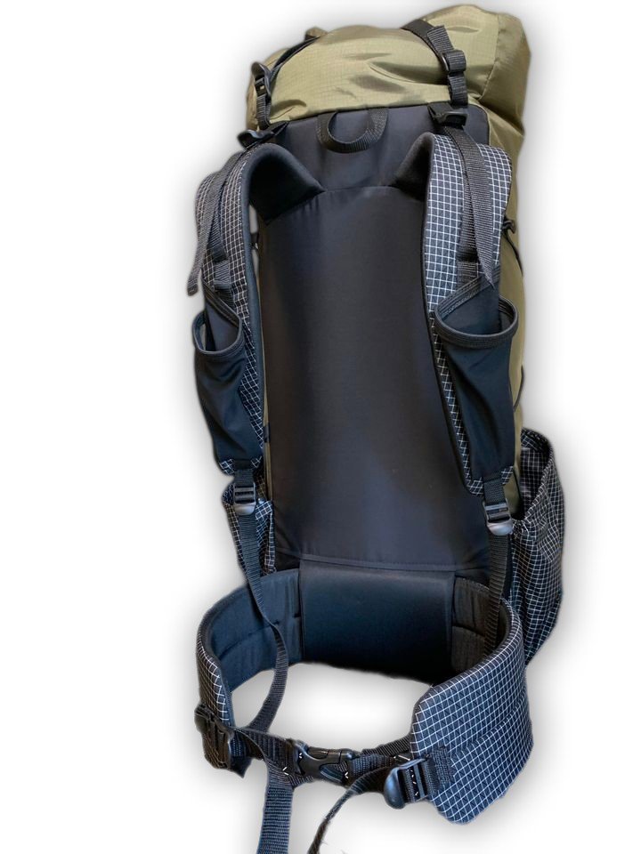 A 60L backpack, following the design of modern ultralight packs: a large roll-top main compartment with multiple external, easy access, generously sized pockets. This example pack weights ~950g including the frame, which allows it to carry loads in excess of 15kg with ease. This is the same tried and tested design I occasionally sell custom made at Prickly Gorse Gear.