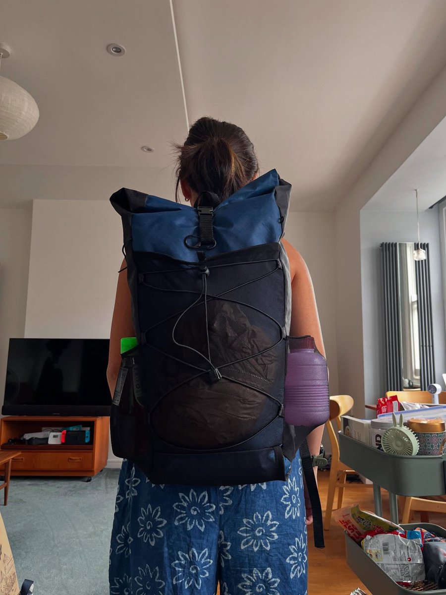 25L+ capacity. The internal volume is approximately 23 litre, each side pocket can fit a litre+ bottle, and the rear pocket can be up to 5 litre extra depending on fabric used.