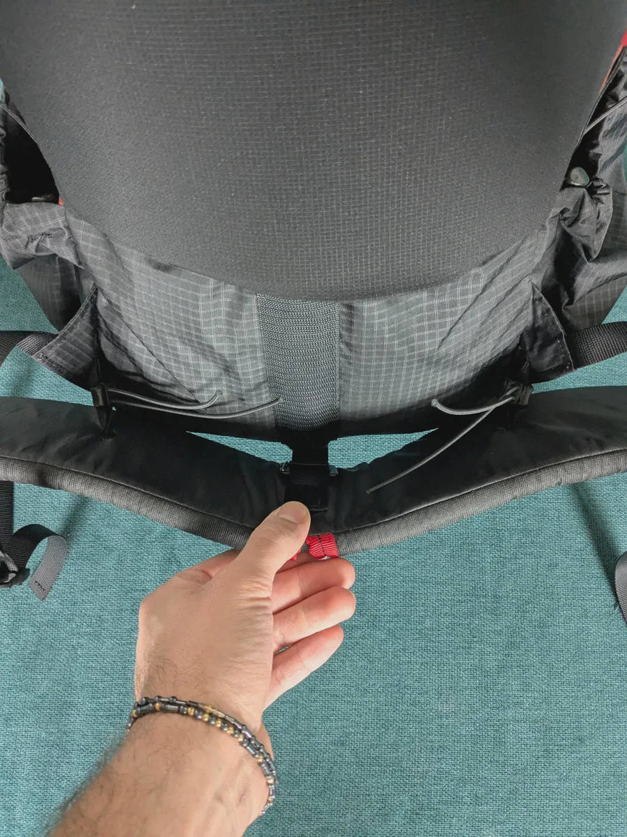 Removable 4 inch wide padded hip belt. Can be removed if you want to save some weight, and replaced with a different length if your weight changes after a long hike.