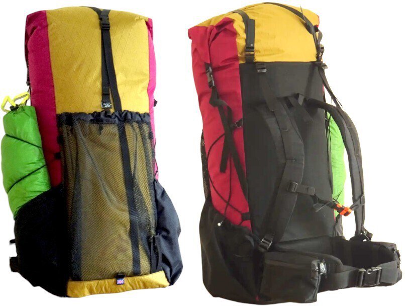 A 60L backpack, following the design of modern ultralight packs: a large roll-top main compartment with multiple external, easy access, generously sized pockets. This example pack weights ~950g including the frame, which allows it to carry loads in excess of 15kg with ease. This is the same tried and tested design I occasionally sell custom made at Prickly Gorse Gear.